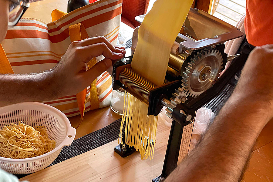 朝ごはんを食べたら、また全員でログハウスに移動して、卒業製麺をしていただきました。これまでの学びを生かして、作りたいものを作る時間です。卒業製麺といっても製麺を卒業するのではなく、卒業制作としての製麺&調理です。