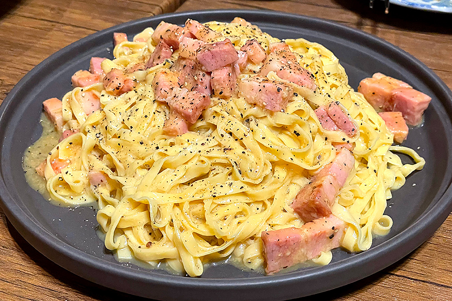 参加者が打った麺で作ったのが、普通のラーメンとトマトだれのセルフ冷やし中華、生パスタのカルボナーラとトマトソース。久しぶりに「趣味の製麺9号」に掲載されている小麦粉と卵だけで作るモチモチさせない生パスタを食べましたけど、そういえばこういう歯ごたえだったなと思い出しました。