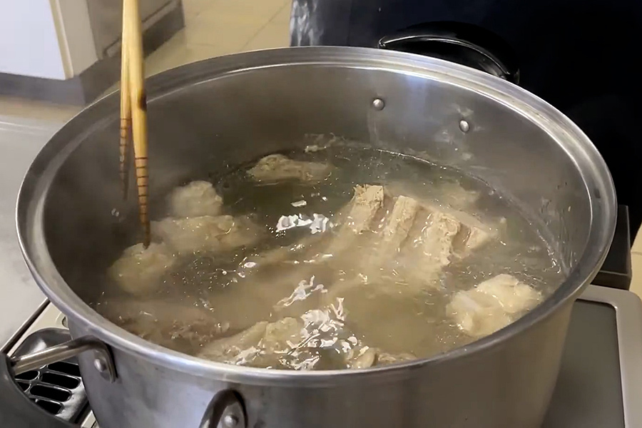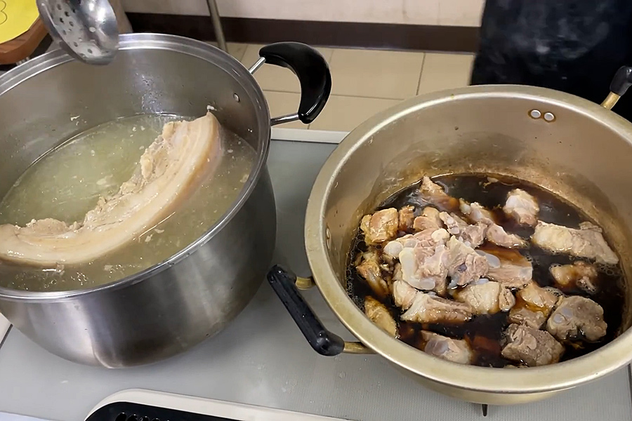 豚バラ三枚肉(皮つき)と、豚バラ先軟骨(軟骨ソーキ)をじっくりと煮てスープを作り、具を泡盛、醤油、みりんの煮汁で味をつけます。