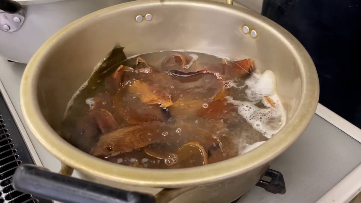 和風出汁を作って、豚のスープと好きな割合で割るというワークショップっぽい制作過程もあるよ。